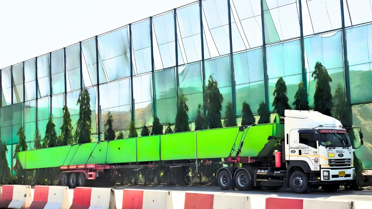 本次货物共包含4件起重机轨道,每件长度为31.20米,采用4辆可伸缩式拖车运输(每辆车运输1件),该类拖车专为超大、超重货物运输而设计。